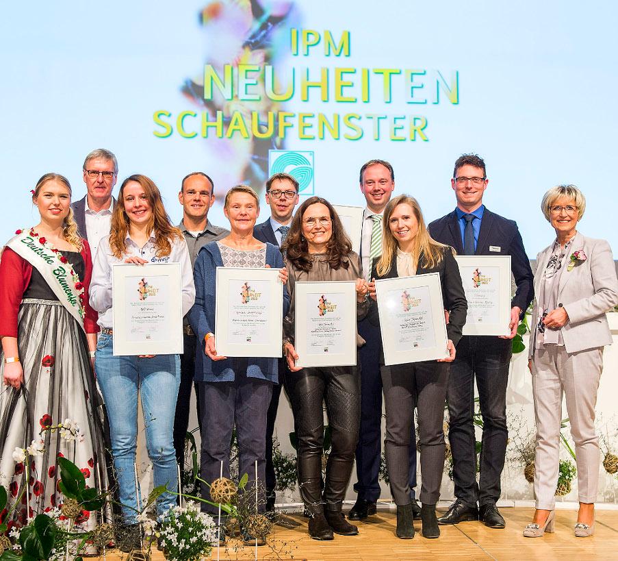 Bereits zum elften Mal haben die Messe Essen und der Zentralverband Gartenbau zur IPM 2018 in acht Kategorien die besten Messeneuheiten prämiert. Am Eröffnungstag gratulierten Lisa Bartels, Blumenfee 2017/2018, und Eva Kähler-Theuerkauf, Beiratsvorsitzende der IPM Essen und Präsidentin des Landesverbands Gartenbau Nordrhein-Westfalen, den stolzen Gewinnern, die sich mit ihren Produkten unter mehr als 60 Bewerbungen durchsetzen konnten.