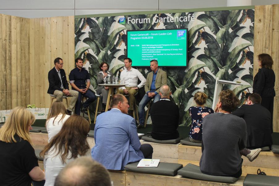 Mit dem Auftakt der Landgard Nachhaltigkeitswochen 2018 zeigte die grüne Erzeugergenossenschaft auf der spoga+gafa, welche vielfältigen Gesichter das Thema Nachhaltigkeit bei Landgard hat. Nach dem Motto „Handel statt Reden“ war dabei die gelebte unternehmerische Verantwortung anhand konkreter nachhaltiger Produkte und Projekte auf dem Landgard Stand für Besucher direkt erlebbar. Wie der Verbraucherwunsch nach Transparenz & Ehrlichkeit den Trend zu nachhaltigen Produkten befeuert und zugleich Erzeuger und Handel vor Herausforderungen stellt, zeigte der Taspo-Talk am 3. September von 10.45 bis 11.30 Uhr im Forum Gartencafé. Dabei rief Dr. Svea Pacyna-Schürheck (Bereichsleiterin Nachhaltigkeitsmanagement bei Landgard) in der Diskussionsrunde dazu auf, stolz auf die tollen nachhaltigen Entwicklungen im Gartenbau zu sein und die Vielfalt nachhaltiger Ideen deutlich sichtbar aufzuzeigen. Peter Opschroef (Landgard Erzeuger und Inhaber Gartenbaubetrieb Opschroef) zeigte auf, wie sich die nachhaltige Produktion in seinem Betrieb als Chance erwiesen hat, sich vom Wettbewerb zu unterscheiden. Am Beispiel torffrei produzierter Anthurien machte Tobias Theuerkauf (Einkauf und Projektmanager Nachhaltigkeit beim Landgard Kunden toom Baumarkt) deutlich, wie nachhaltige Leuchtturmprojekte Erzeuger zu mehr Umwelt- und Ressourcenschutz motivieren können. Wie wichtig gerade in Nachhaltigkeitsfragen im Zeitalter der Digitalisierung eine transparente Kommunikation und Rückverfolgbarkeit der Produkte bis zum Erzeuger sind, erläuterten Stephan Schaller (Senior Consultant Collaborating Centre on Sustainable Consumption and Production gGmbH) sowie Dr. Kristian Moeller (CEO GlobalG.A.P.) Denn, darin waren sich alle Teilnehmer einig: Als Geschäftsmodell ist Nachhaltigkeit einer der Erfolgsfaktoren der Zukunft in der grünen Branche.