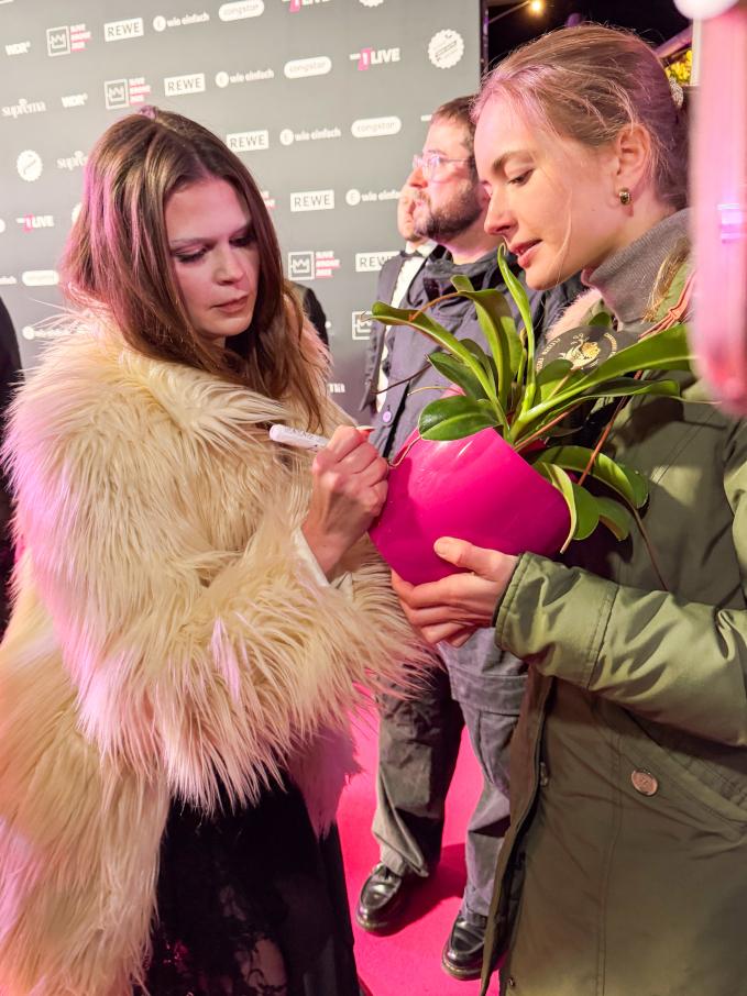 ... und Ikkimel, Gewinnerin in den Kategorien „Bester Newcomer“ und „Bester Partysong“, ließen es sich nicht nehmen, ihre persönlichen 1LIVE Krone x 1000 gute Gründe-Pflanztöpfe zu signieren.